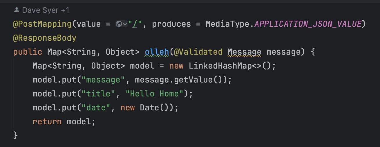 Both method are relatively simple, the first one handles HTTP POST requests to the root URL ("/") and return some kinds of map info such as current date etc., and the second one is mapping a KV pair into the end of actuator info.