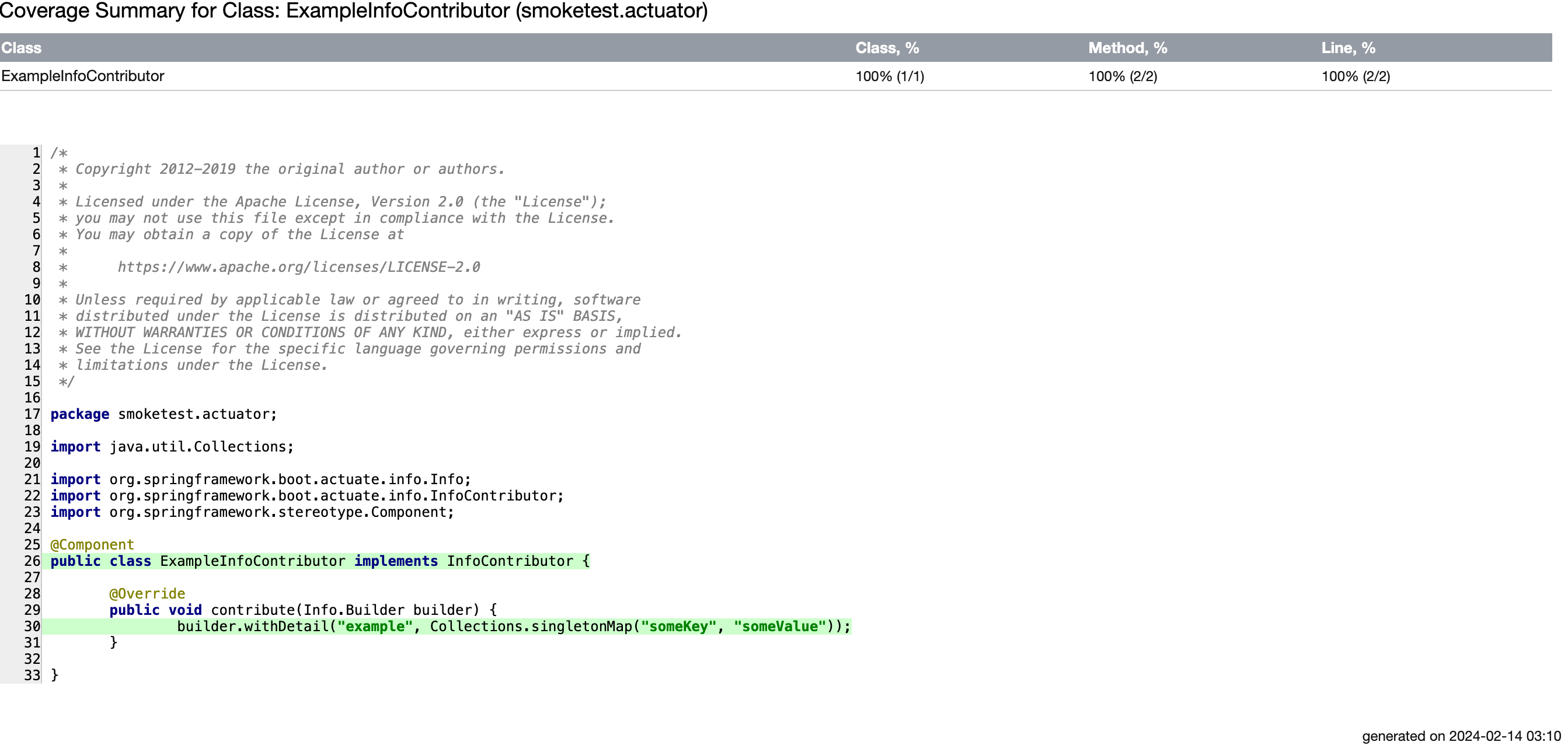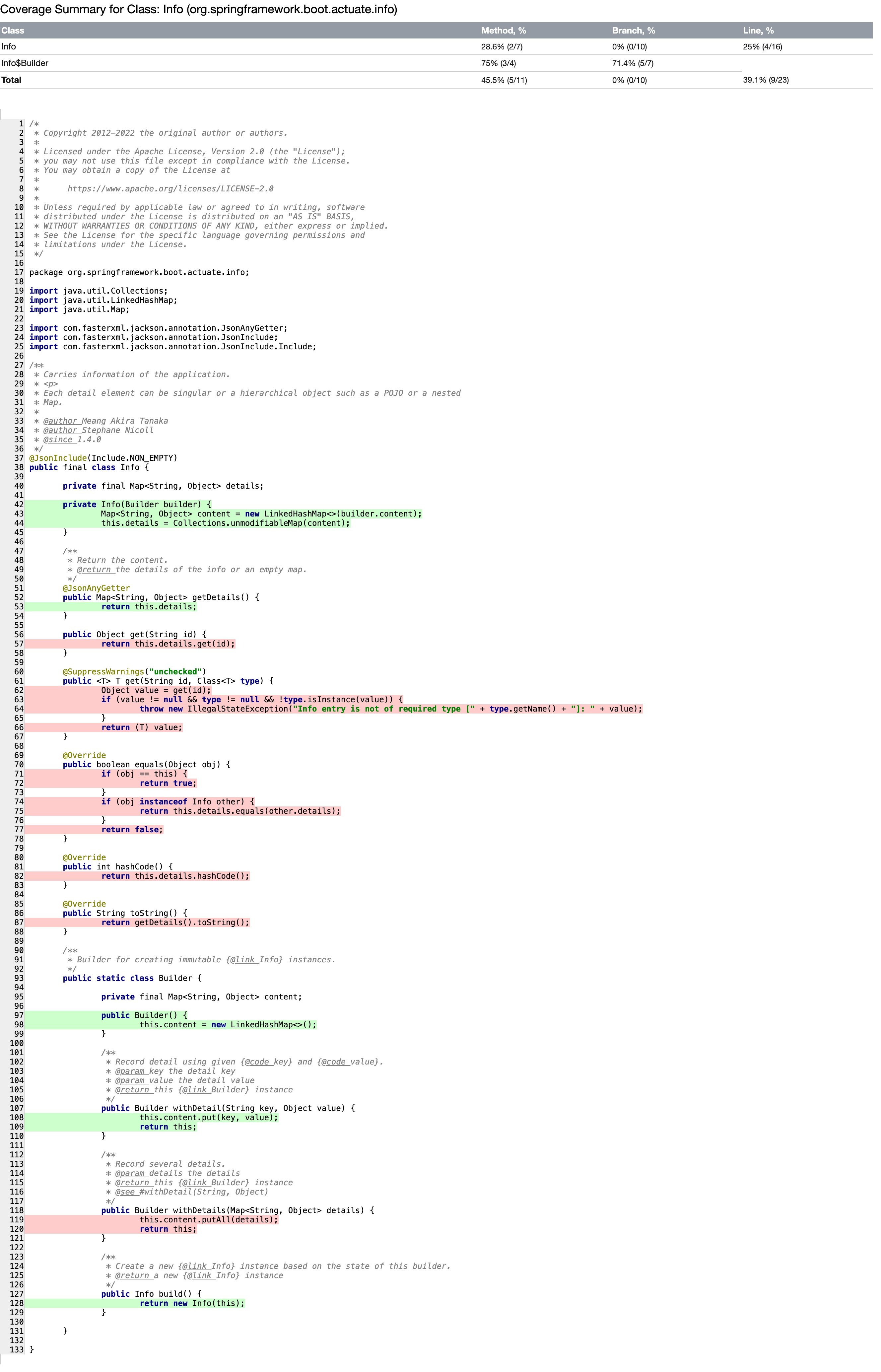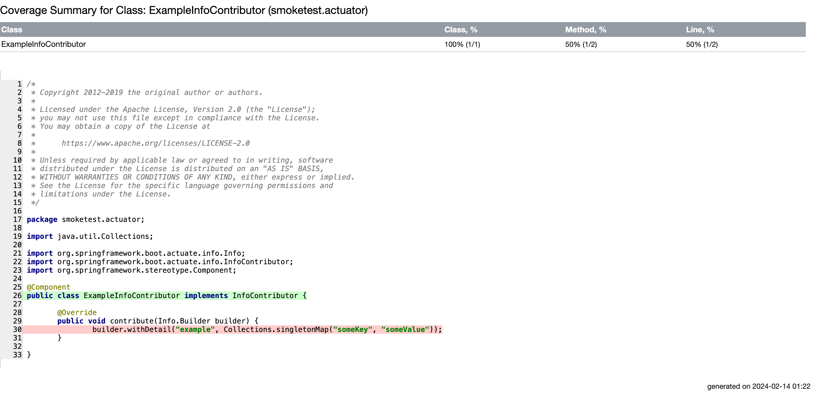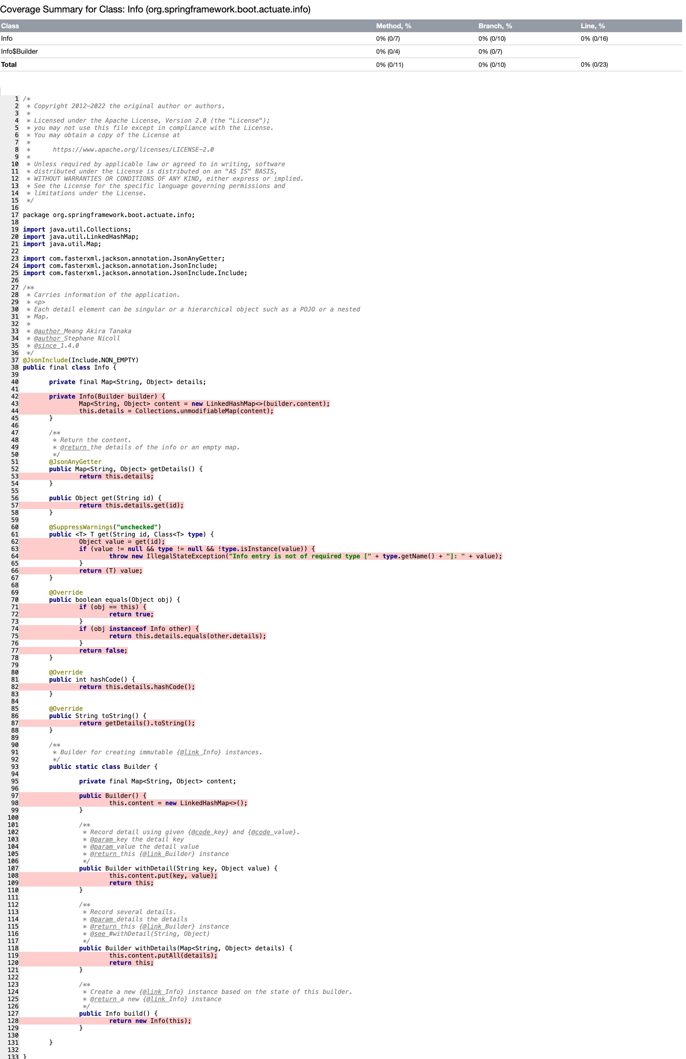 This test case effectively enhances the test coverage of the Spring Boot Actuator’s info endpoint, particularly focusing on the contribute method’s functionality. For comprehensive coverage, further tests exploring additional branches and methods within the info class are recommended.